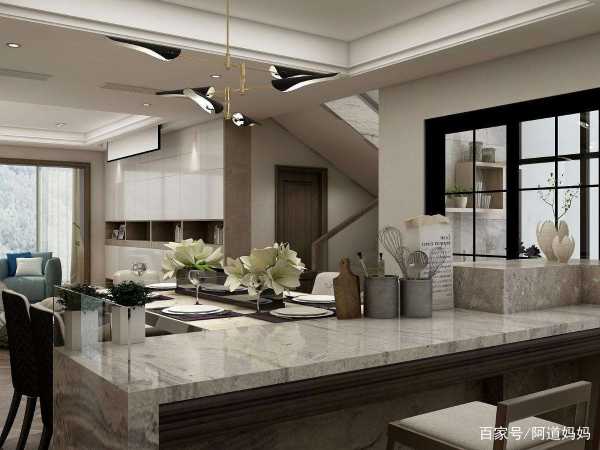 进行别墅的餐厨一体化设计有厨房吧台饭桌一体式,这类方式是现在十分火爆的方式,也是倍受青睐种树的网络红人厨房吧台,通常用在U型或是一字形的厨房布局,厨房吧台与饭桌中间18厘米的坡度,及其相接处饭桌的侧插解决,产生了室内空间中明显的几何图形标记,在功用上也更为多元化,饭桌的长短假如室内空间充足,最好是保证更长,更强更舒服的达到用食、社交媒体、学习培训,玩耍、品铭等作用。