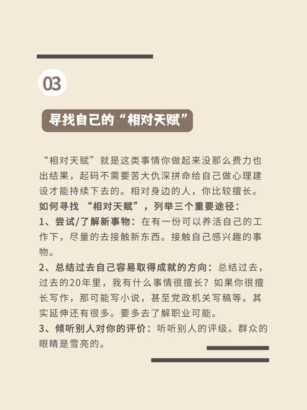 所以你要一开始就要找出自己最感兴趣的事,并为之努力,去靠近,即便开始真的很难,但熬到最后,你会发现这是最幸福的。不要以为可以一边做不喜欢的工作,可以一边学自己喜欢的东西,这对INFPer真的很难,你会受到身体和精神的双重折磨,除非你真的想把大好青春慢慢消耗掉,身在曹营心在汉,总会离开的。